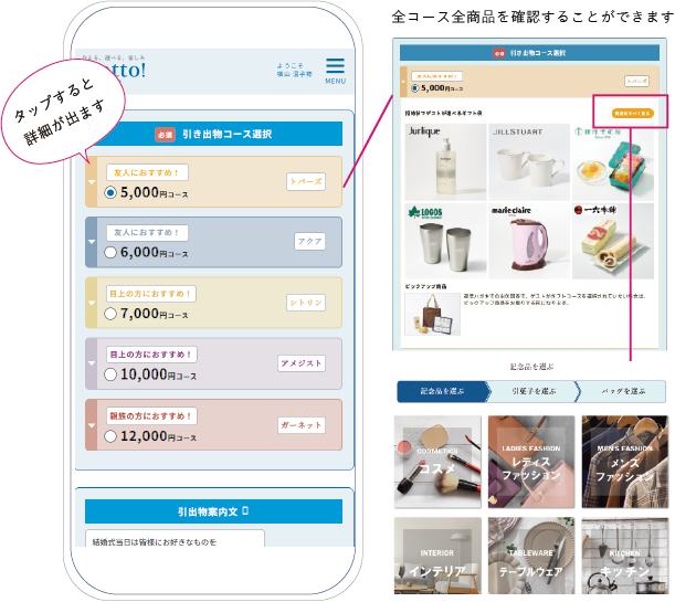 ゲストの方に事前に選んでもらう引出物コースを選択しますコースの中には、記念品(メインのギフト)・引菓子・縁起物またはトートバッグの3品の価格が含まれています招待状を送付しただけでは料金は発生しません