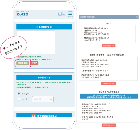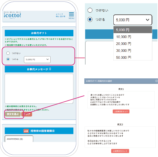 遠方の方をご招待する際に、招待の時点でお車代を付けることができます。