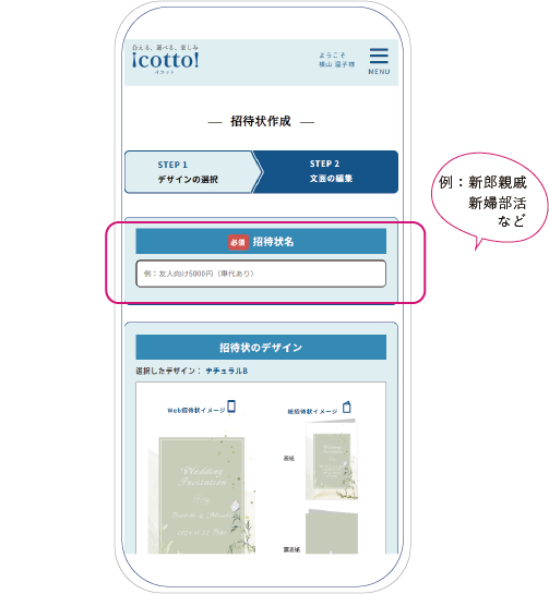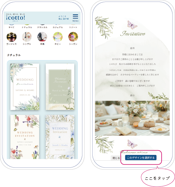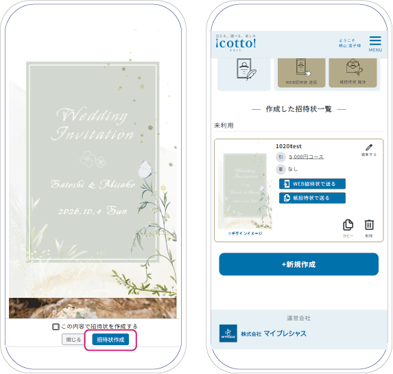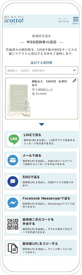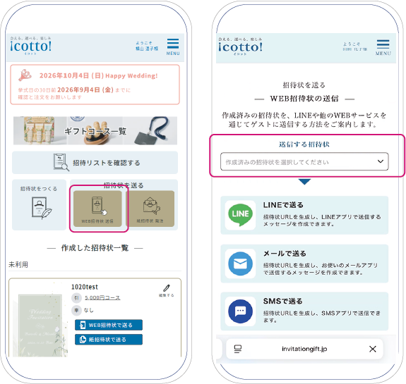 マイページTOPの【招待状を送る】のWEB招待状送信をタップし