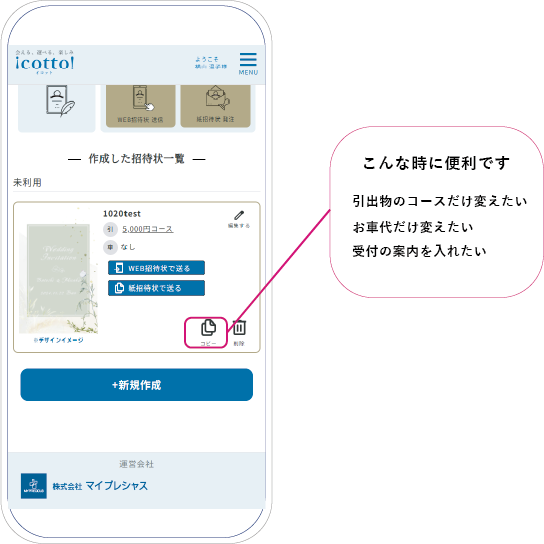 マイページTOPに表示される「作成した招待状一覧」の【コピー】アイコンをタップすると、作成済みの内容が反映された状態の招待状作成画面に遷移します引出物の価格違いやお車代の有無、付箋の内容など、ゲストにより招待状の内容を分ける必要がある際も、変える必要のないお写真の登録や、入力が大変な会場の住所・時間などの再入力が不要なため、簡単に作成することができます。