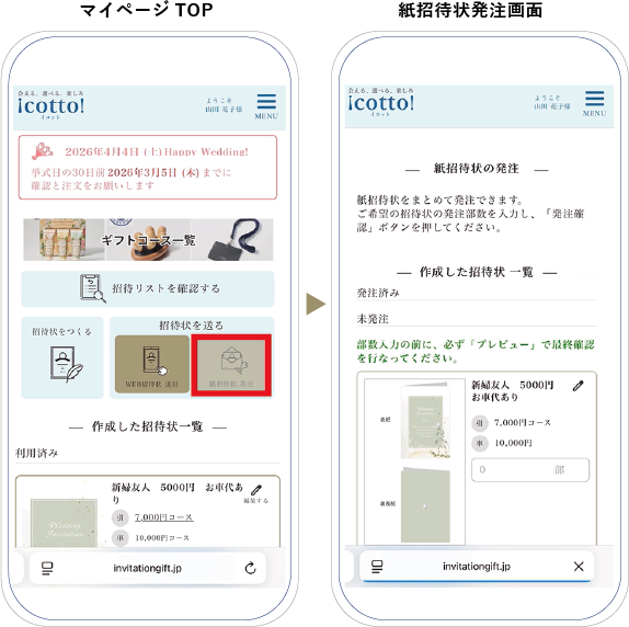 マイページTOPに表示される「招待状を送る」の紙招待状発注をタップします。