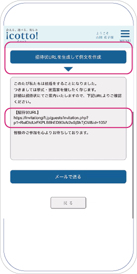 【招待状URLを生成して文を作成】をタップして、送信する際の文を作成して
